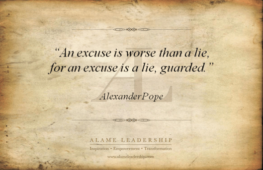AL Inspiring Quotes: On Excuses 06 Monday Feb 2012 Posted by Alame Leadership in AL Inspiration Quotes ≈ Leave a comment TagsInspiration, inspirational poster, inspirational quotes, motivation quotes, motivational, motivational poster, quote of the day, Quotes, quotes for inspiration, quotes for motivation Watch out the excuses you tell yourselves and others why you can’t be who you would like to be, do what you desire to do, or have what you want to have because these same stories and excuses which protect you now could imprison you forever. Share this: Click to share on X (Opens in new window) X Click to share on Facebook (Opens in new window) Facebook Click to email a link to a friend (Opens in new window) Email Click to print (Opens in new window) Print Like Loading... Related