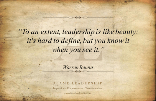 AL Inspiring Quote on Leadership 23 Thursday Aug 2012 Posted by Alame Leadership in AL Inspiration Quotes ≈ Leave a comment To an extent, leadership is like beauty: it’s hard to define, but you know it when you see it.” Warren Bennis Share this: Click to share on X (Opens in new window) X Click to share on Facebook (Opens in new window) Facebook Click to email a link to a friend (Opens in new window) Email Click to print (Opens in new window) Print Like Loading... Related